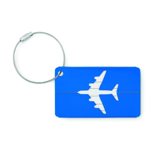 Aluminium airplane luggage tag with name and address label. Comes with metal string and screw connector.