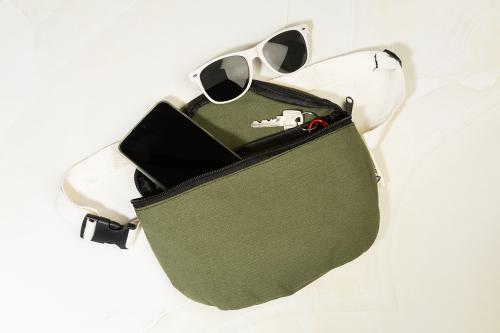 Recycled canvas waist bag with zipped compartment and adjustable strap. 70% recycled cotton and 30% recycled polyester. With distinctive recycled cotton label.