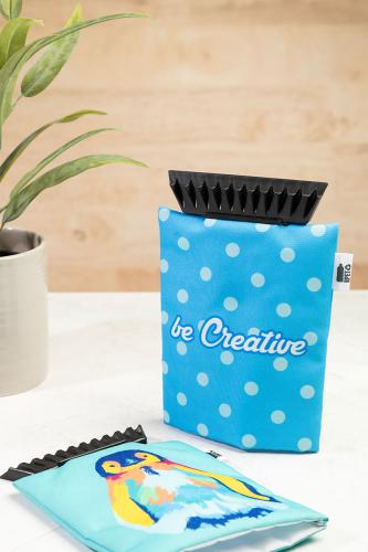 Custom made plastic ice scraper with 600D RPET polyester glove. Price includes all over sublimation printed graphics. MOQ: 50 pcs.
