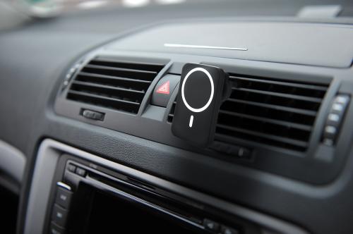 Magnetic car mobile holder in recycled ABS housing with built-in wireless fast charger (15W) and adjustable air vent mounting. Including self-adhesive metal ring to use the magnetic function on any wirelessly chargeable device. Compatible with iPhone® 12 or newer. Including USB charger cable.
