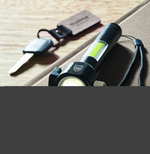 3 in 1 aluminium torch with emergency hammer and seat belt cutter. It has a COB light on side and front. Including magnet and hand strap. Built-in rechargeable 500mAh battery included.