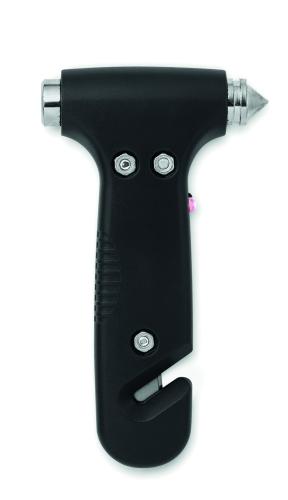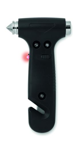 3 in 1 emergency hammer with belt cutter and LED light made of ABS. 3 AG3 batteries included.