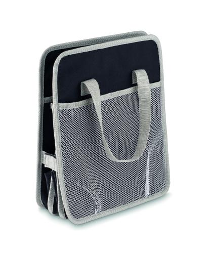 Foldable car organizer in 600D polyester with mesh pocket on side. When not in use, you can fold this up for compact storage. Also, this makes driving safer as it will prevent items from possibly rolling under the drivers feet.