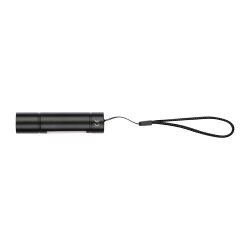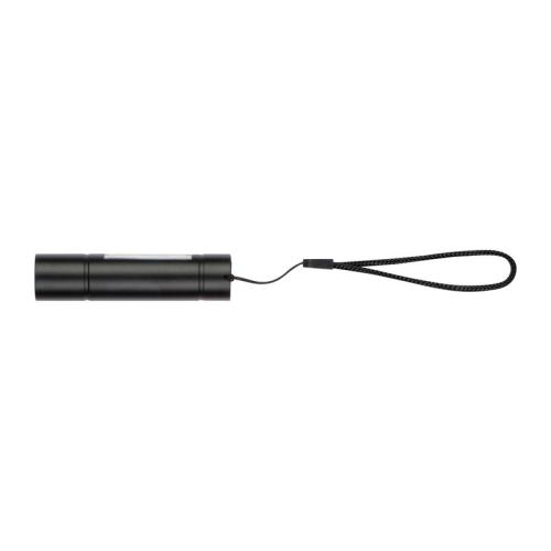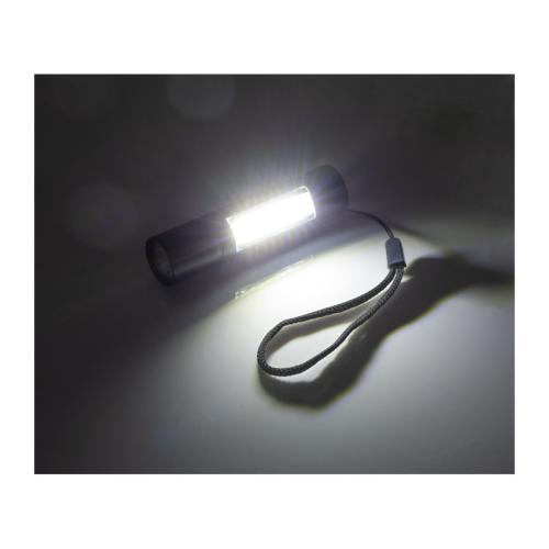 Rechargeable aluminum battery flashlight (400mAh) with three light modes: LED light front continuous and flashing and COB light side. A micro USB charging cable is included.