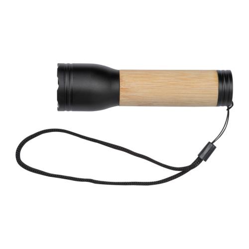 Rechargeable torch made from recycled aluminium with bamboo handle with 400 lumen brightness and a battery capacity of 300 mAh. Type C charging cable included.