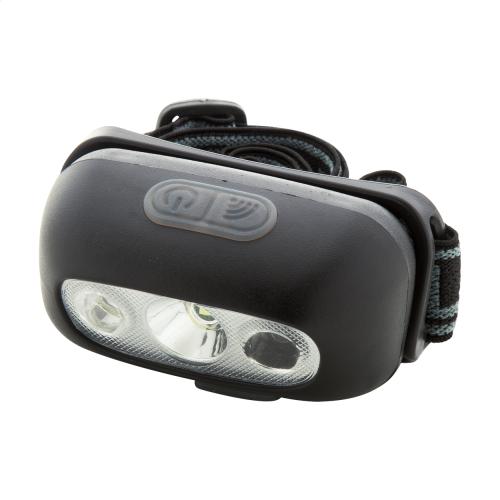 Plastic headlamp with built-in USB rechargeable battery (400 mAh) and adjustable strap. With high power COB light and dual motion sensors. With high, low and motion sensitive light modes. Including USB charger cable.