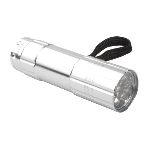 9 LED aluminium flashlight with carry strap. With 3 AAA batteries.