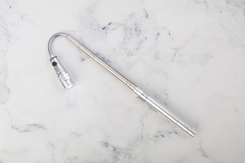 3 LED aluminium flashlight with extendible and flexible head, magnet on top and metal side clip. Including button cell batteries. Max. length: 57 cm.