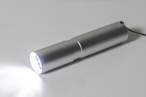 Recycled aluminium flashlight with built-in USB rechargeable battery (400 mAh) and carry strap. With zoomable high power COB light and 3 light modes. Including USB charger cable.