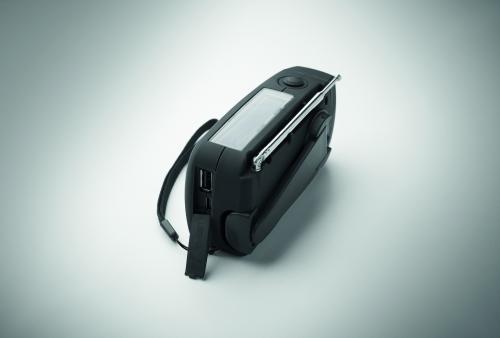 Portable AM/FM radio in ABS with LED Torch (2 settings) and a 1200mAh Power bank for emergency charging. Self powered by solar and hand crank.