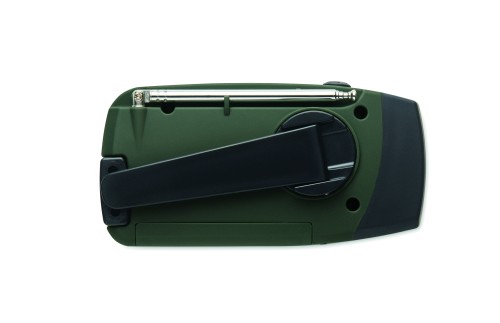 Portable AM/FM radio in ABS with LED Torch (2 settings) and a 1200mAh Power bank for emergency charging. Self powered by solar and hand crank.