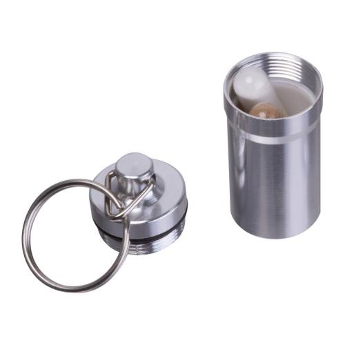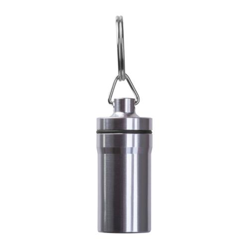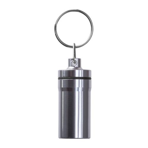 Keychain container with a stainless steel exterior and plastic interior. Ideal for safely storing small items while on the go.