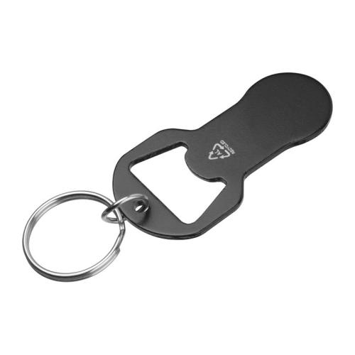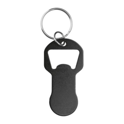 Keychain made of recycled aluminum with integrated bottle opener and shopping cart token. Lightweight, practical, and ideal for everyday use.