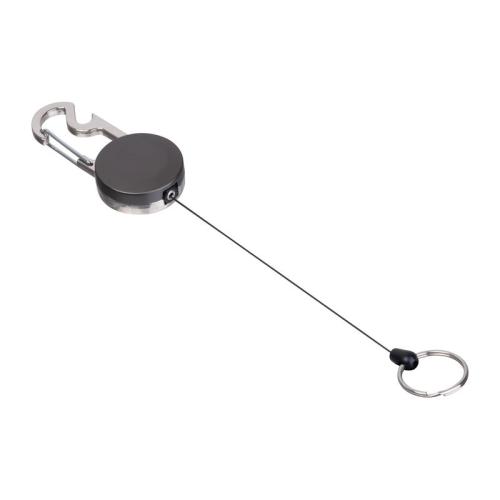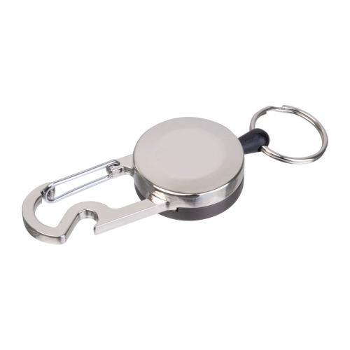 Retractable metal keychain with transparent card holder and matel carabiner featuring a bottle opener. The key ring extends up to 55 cm with a retractable reel effect.