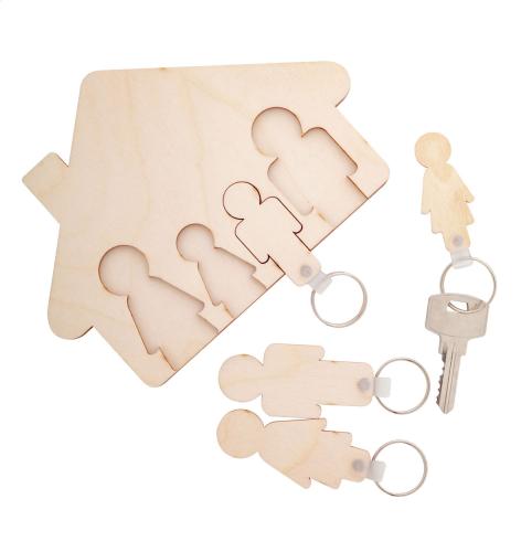 House shaped, wall key holder with 4 removable keyrings in family design. Made of birch plywood.