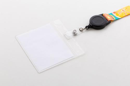 Custom made RPET polyester keyring with sublimation printed graphics on both sides. With inside RPET label, telescopic badge holder, aluminium carabiner and metal keyring. MOQ: 100 pcs.
