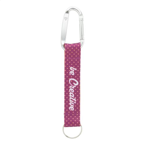 Custom made RPET polyester keyring with sublimation printed graphics on both sides. With inside RPET label, recycled aluminium carabiner and metal ring. MOQ: 100 pcs.