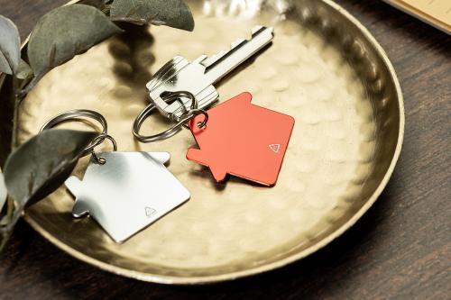 House shaped, recycled aluminium keyring with metal ring.