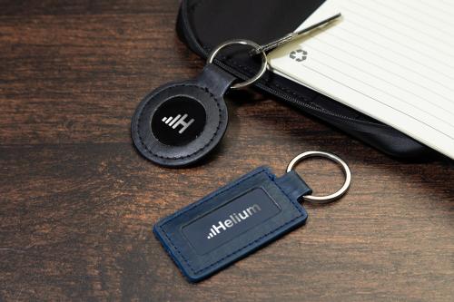 Rectangular shaped, recycled PU leather keyring with metal ring and stainless steel logo plate with rubberized finish. With special coating for mirror laser engraving.
