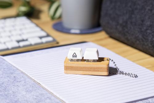 Bamboo keyring with metal chain and 2 recycled ABS antistress buttons imitating mechanical keyboard buttons.