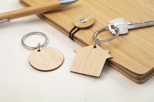 House shaped bamboo keyring with metal ring.