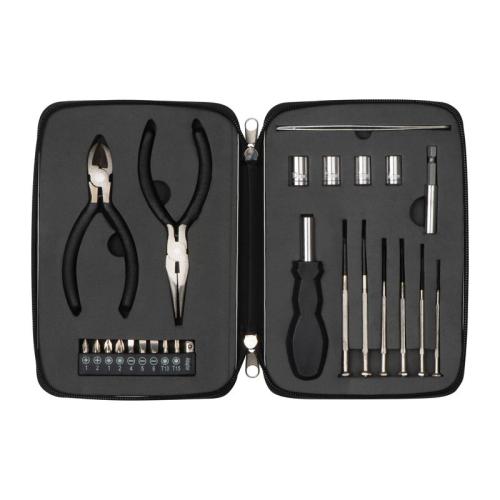 For the road or at home, this 25-piece aluminium tool box with zipper contains 2 pliers, bits and screwdrivers in various sizes and tweezers.