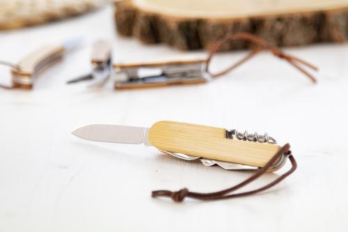 Stainless steel pocket knife with bamboo handle and 9 functions. With PU leather carry strap.