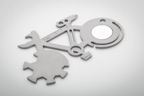 Stainless steel, bicycle shaped multi tool with 11 functions.