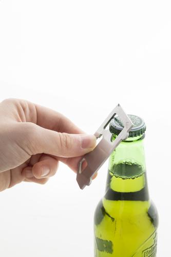 Truck shaped, recycled stainless steel multi tool with bottle opener, Philips screwdriver and 3 flat wrenches.