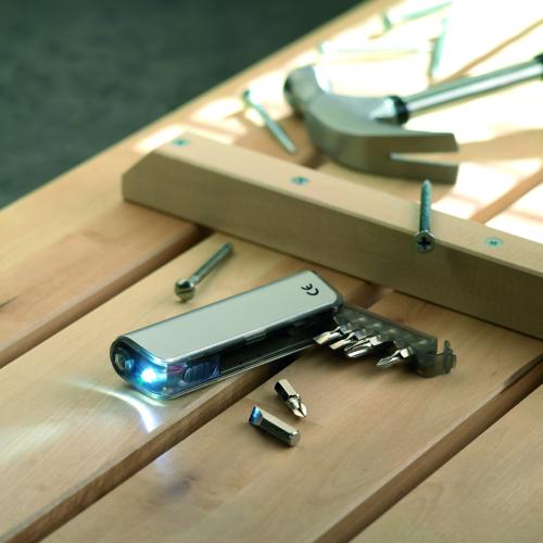 Multi-tool holder and LED torch in ABS casing with metallic finish. Includes 6 different interchangeable screwdriver heads. 3 cell batteries included.