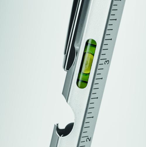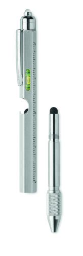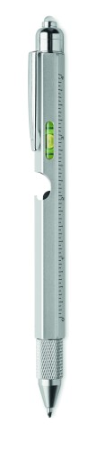 Twist action spirit level pen in stainless steel with ruler, stylus and Phillips head and flat head screw driver bits and LED. 3 AG batteries included. Blue ink.