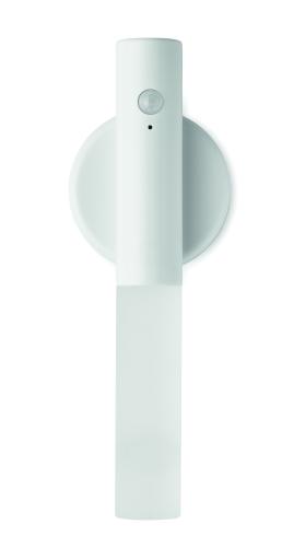 Emergency sensor torch light in ABS and acrylic with magnetic base. Built-in 300 mAh rechargeable battery and charging cable. Base can be mounted on the wall with included 3M sticker.