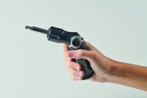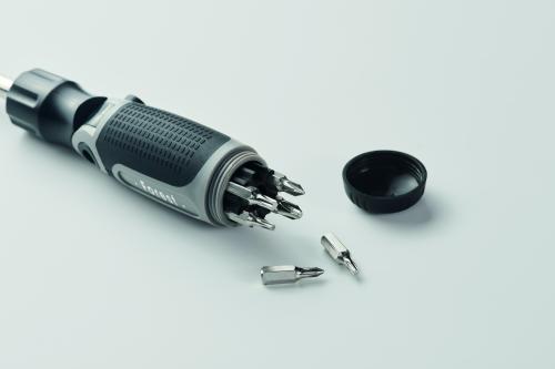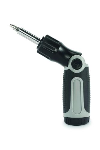 Bendable screwdriver set with ABS handle and 12 iron bits including Phillips, flat head, hex and torx types.