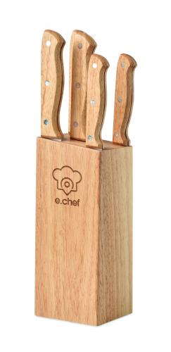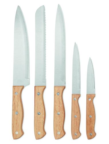 Wooden knife set. Includes base holder and 5 knives: Chef, bread, slicing, multi-functional and paring. Stainless steel with wooden handle.