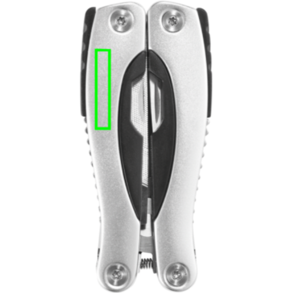 Aluminium multitool, handle with black details, 14 functions, packed in black 600D pouch.