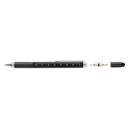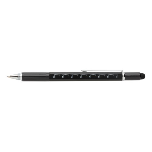 Multifunction pen with ruler (7cm) , spirit level, screw driver, stylus tip and ballpoint with blue writing ink (up to 400m) Made out of high quality brass material with aluminium clip.