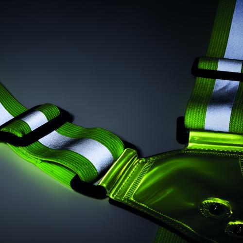 Adjustable 360° reflective body belt with 4 LED on front and 4 LED's on the back and silver stripes. Included 2 CR2032 battery. For promotional use only.