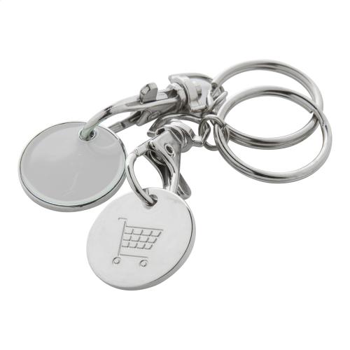 Metal keyring with shopping trolley coin. One side of the coin is painted, the other side has an engraved shopping trolley. Coin size: ø23×1,7 mm.