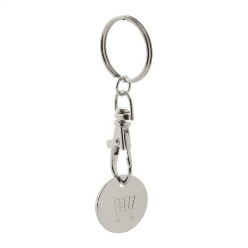 Metal keyring with shopping trolley coin. One side of the coin is painted, the other side has an engraved shopping trolley. Coin size: ø23×1,7 mm.