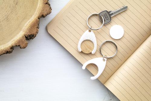 Bamboo shopping trolley coin in ecological wheat straw plastic keyring. Coin size: ø25×2 mm.