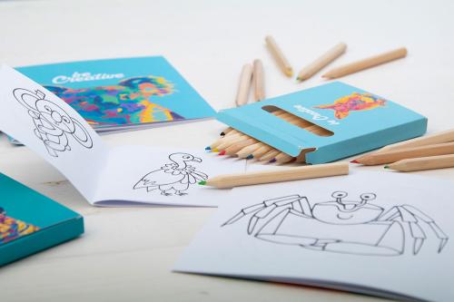 Custom made colouring set in full-colour printed paper box. Including wooden coloured pencils (12 pcs) and thematic colouring book. MOQ: 100 pcs.
