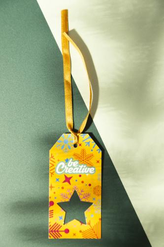 Custom made, full colour printed paper Christmas gift tag with die-cut Christmas motive and golden ribbon. Price includes digital printing on one side. MOQ: 100 pcs.