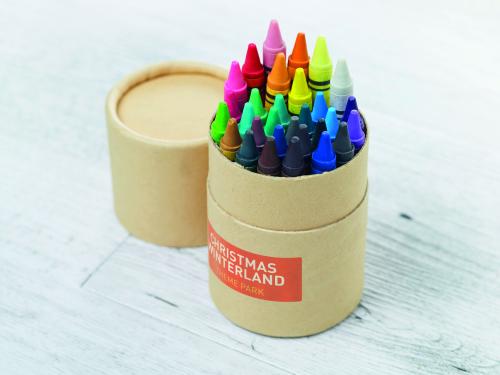 30 wax crayons in recycled paper tube.
