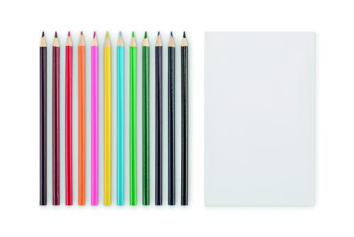 Children’s drawing set with 50 recycled paper sheets and 12 wooden colouring pencils. With kraft paper cover.