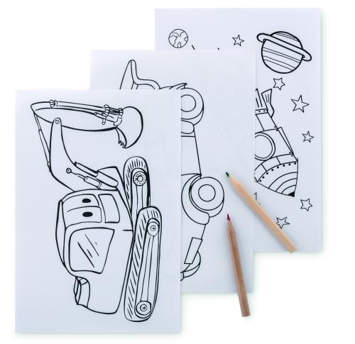 Children colouring set with 30 colouring recycled paper sheets. Includes 6 colouring pencils, sharpener and eraser.