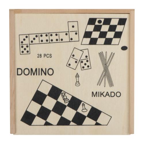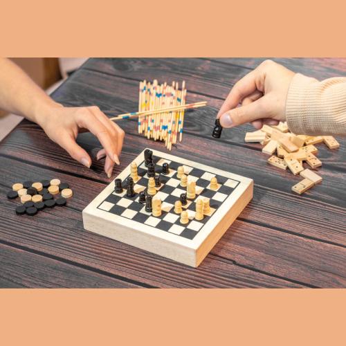 Game set in a wooden box consisting of chess, mikado, checkers and dominoes. The next game night completely in one box.