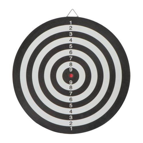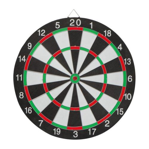 Double-sided dartboard with 6 darts and metal loop for fastening.
