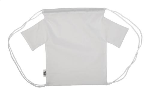 Custom made, T-shirt shaped drawstring bag for children with coloured strings, 190T RPET polyester. With all over sublimation printed graphics and distinctive RPET label. MOQ: 25 pcs.