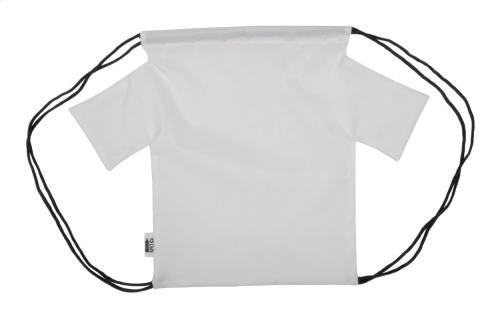 Custom made, T-shirt shaped drawstring bag for children with coloured strings, 190T RPET polyester. With all over sublimation printed graphics and distinctive RPET label. MOQ: 25 pcs.