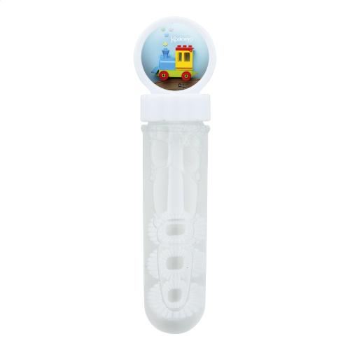 Bubble blower in coloured plastic. With 30 ml bubble liquid.